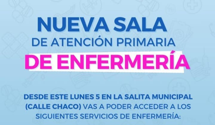 El hospital municipal Dr. José María Minella, informa a la población que desde el lunes 5 de mayo del corriente año, habrá atención primaria de enefermería en la salita municipal de calle Chaco, casi esquina Salta, de Bº Monterrey (Dirección de Desarrollo Social).