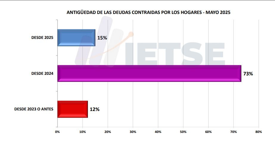 El dato más alarmante es que casi tres de cada cuatro deudas activas se originaron en 2024, lo que coincide con la fuerte devaluación del peso (ocurrida en diciembre 2023), la alta inflación del primer cuatrimestre 2024 y la depresión salarial de ese año. La renovación y acumulación de deuda, incluso en 2025, demuestra la incapacidad de los hogares para saldar sus pasivos anteriores.