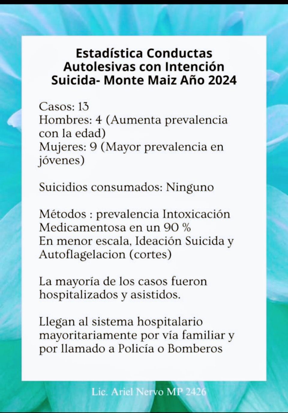 El informe de actuación durante este tiempo indica que hubo 13 casos de este tipo, de los cuales 9 fueron hombre y 4 fueron mujeres. Afortunadamente no hubo consumación de suicidios entre ellos. El método de prevalencia fue la intoxicación con medicamentos en un 90% de los casos. El resto fue por ideación suicida y autoflagelación. En los varones tuvo ingerencia la edad, ya que se trató de personas de edad avanzada; mientras que en las mujeres la prevalencia fue en femeninas jóvenes. La mayoría de los casos fueron hospitalizados y asistidos por personal profesional.