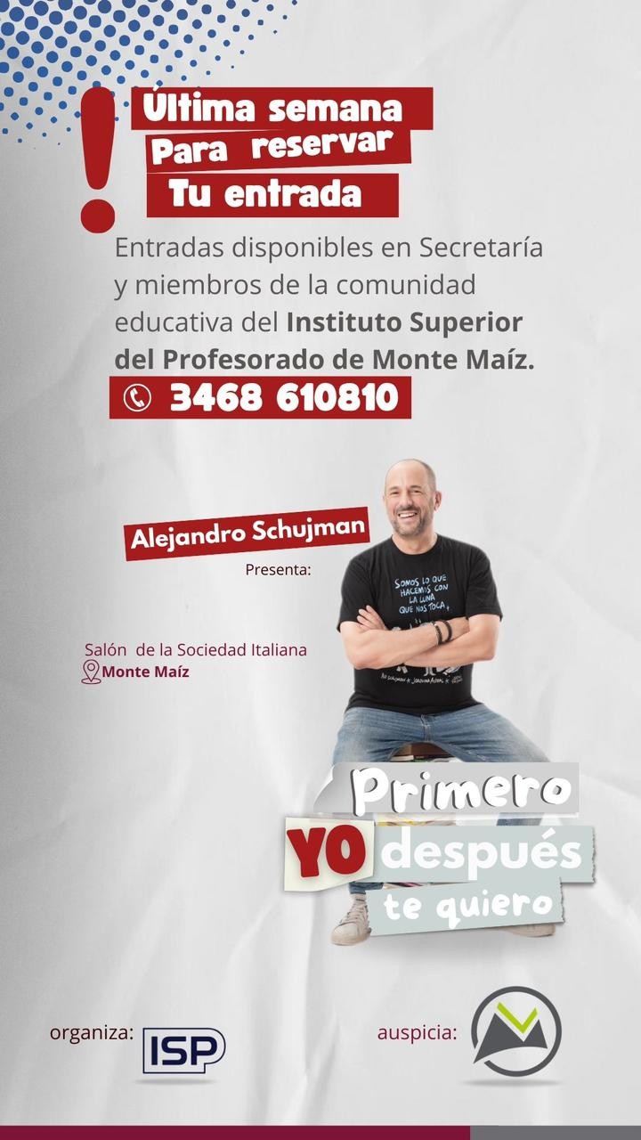 Schujman se presenta este martes, 27 de mayo a las 21 hs. en Monte Maíz en el salón de la Sociedad Italiana. Anticipadas $15.000 al te: 3468-610810. En boletería: $20.000.