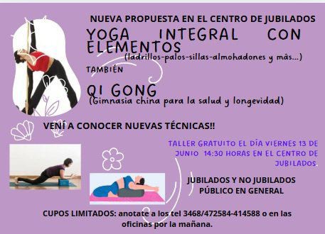 Se trata de un Taller de Yoga Integral con elementos, tales como ladrillos, palos, sillas, almohadones y más. Y Qi Gong, gimnasia china para la salud y longevidad.