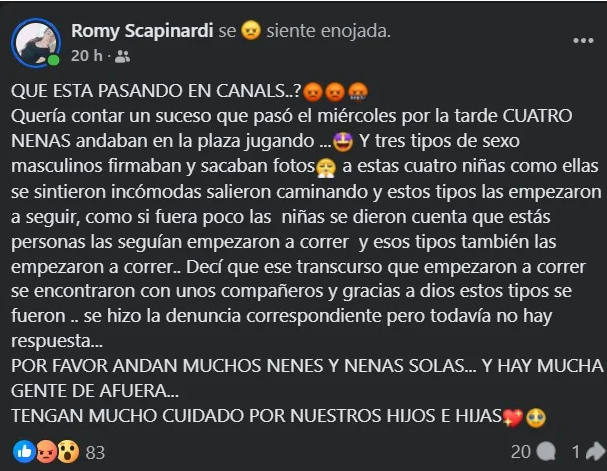 Un grave episodio fue denunciado por una vecina de la localidad de Canals a través de una publicación en redes sociales que rápidamente se viralizó. Según su testimonio, el miércoles por la tarde, cuatro niñas que se encontraban jugando en la plaza central fueron observadas, fotografiadas y filmadas sin consentimiento por tres hombres.