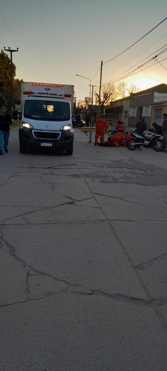 Se recibe llamado solicitando colaboración de Bomberos por colisión entre una motocicleta y una bicicleta. Al arribo se procede a la inmovilización y posterior traslado de femenina mayor de edad ocupante del rodado mayor con escoriaciones múltiples y traumatismo en miembro inferior izquierdo. También se trasladó a masculino menor de edad ocupante del rodado menor al hospital local para control.