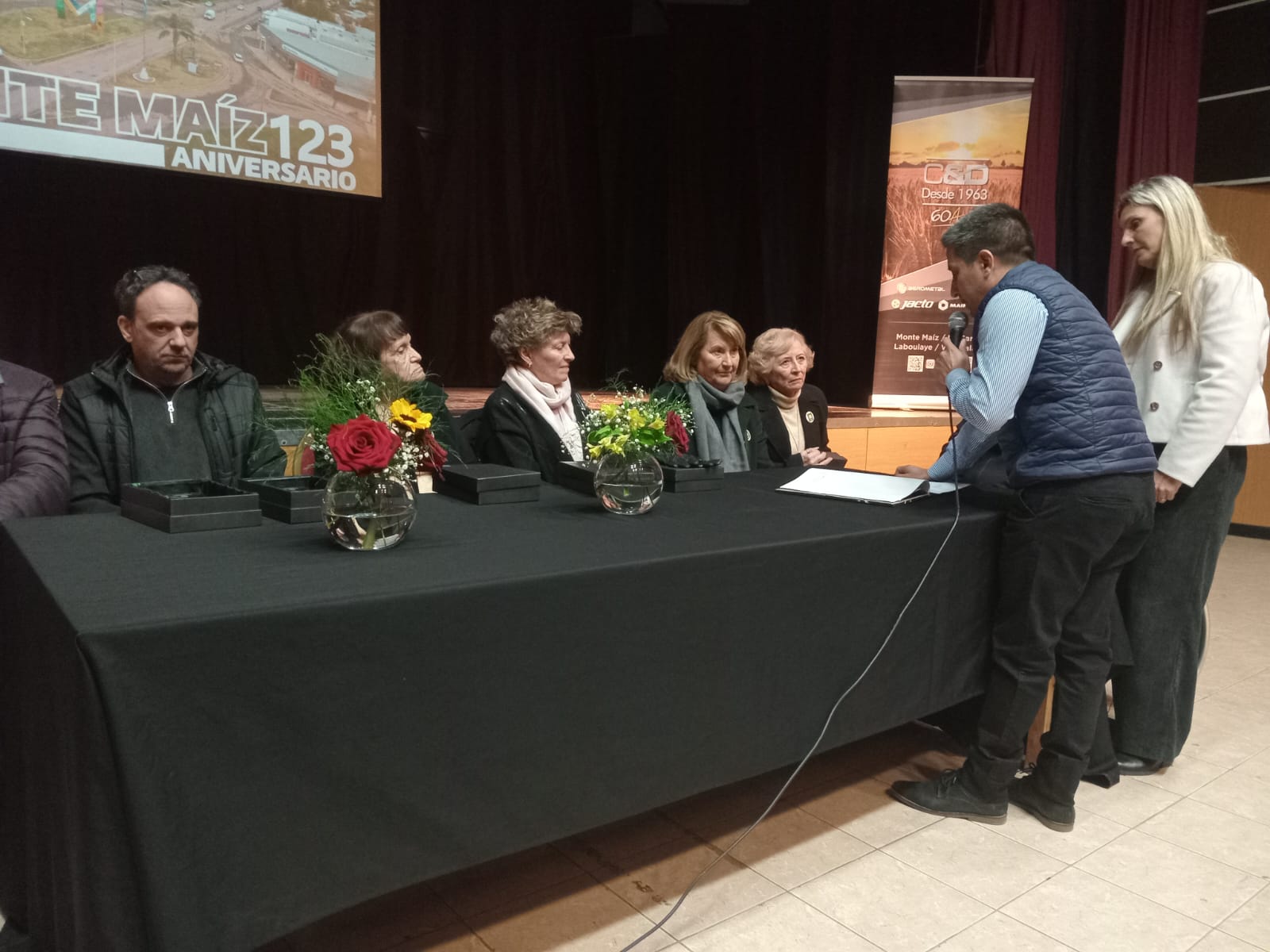 Paralelo a esto, y también en el marco del cumpleaños de Monte Maíz, el municipio reconoció el trabajo de los integrantes y fundadores del Centro de Estudios Históricos con la entrega de una placa recordatoria a quienes estuvieron presentes en el acto: Susana Reggiori, Cristina Argüello, Estela Balfagón, Ada Raquel de López, Sebastián Santa Coloma y Juan José Pardal. También se lo reconoció con el mismo presente a José Carón, realizador audiovisual, quien está a cargo de la edición de los documentales.