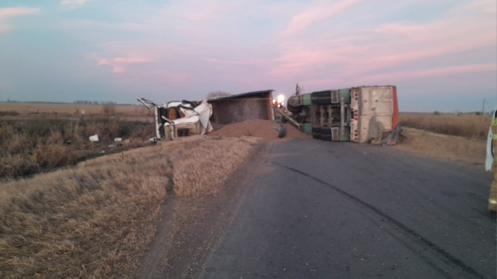 En horas de la mañana de este jueves, Bomberos Voluntarios de Monte Maíz debieron intervenir en ruta provincial Nº11, a la altura de la curva hacia Isla Verde, por el vuelco en solitario de un camión.