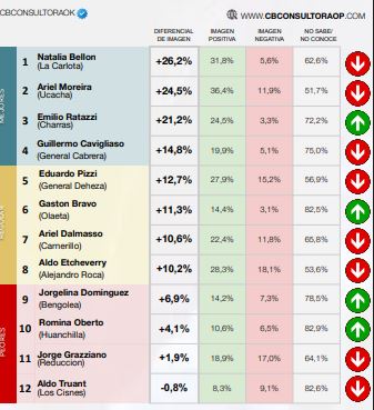 Siempre considerando la fragilidad de este tipo de estudios, que se hacen dentro de cada departamento y que la mayoría de los encuestados, por lo general, desconocen por quien se le pregunta, salvo que sea el intendente de su localidad o ciudad.
