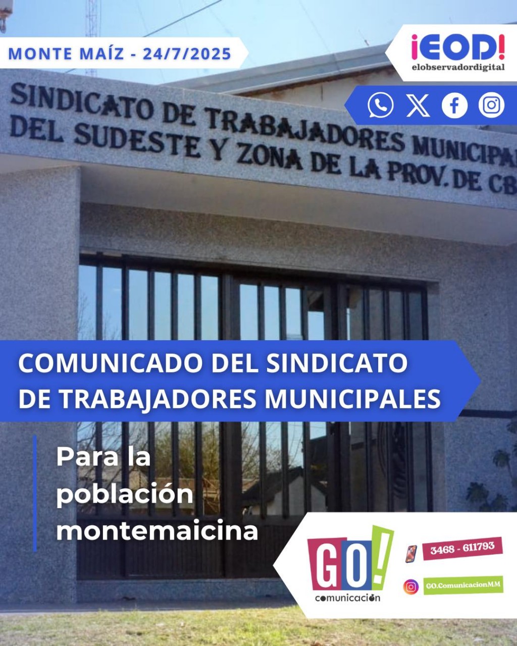 El Sindicato de Trabajadores Municipales del Sudeste de la Provincia de Córdoba envió un Comunicado a ElObservadorDigital para su respectiva difusión a la población de Monte Maíz. A continuación, el Comunicado: