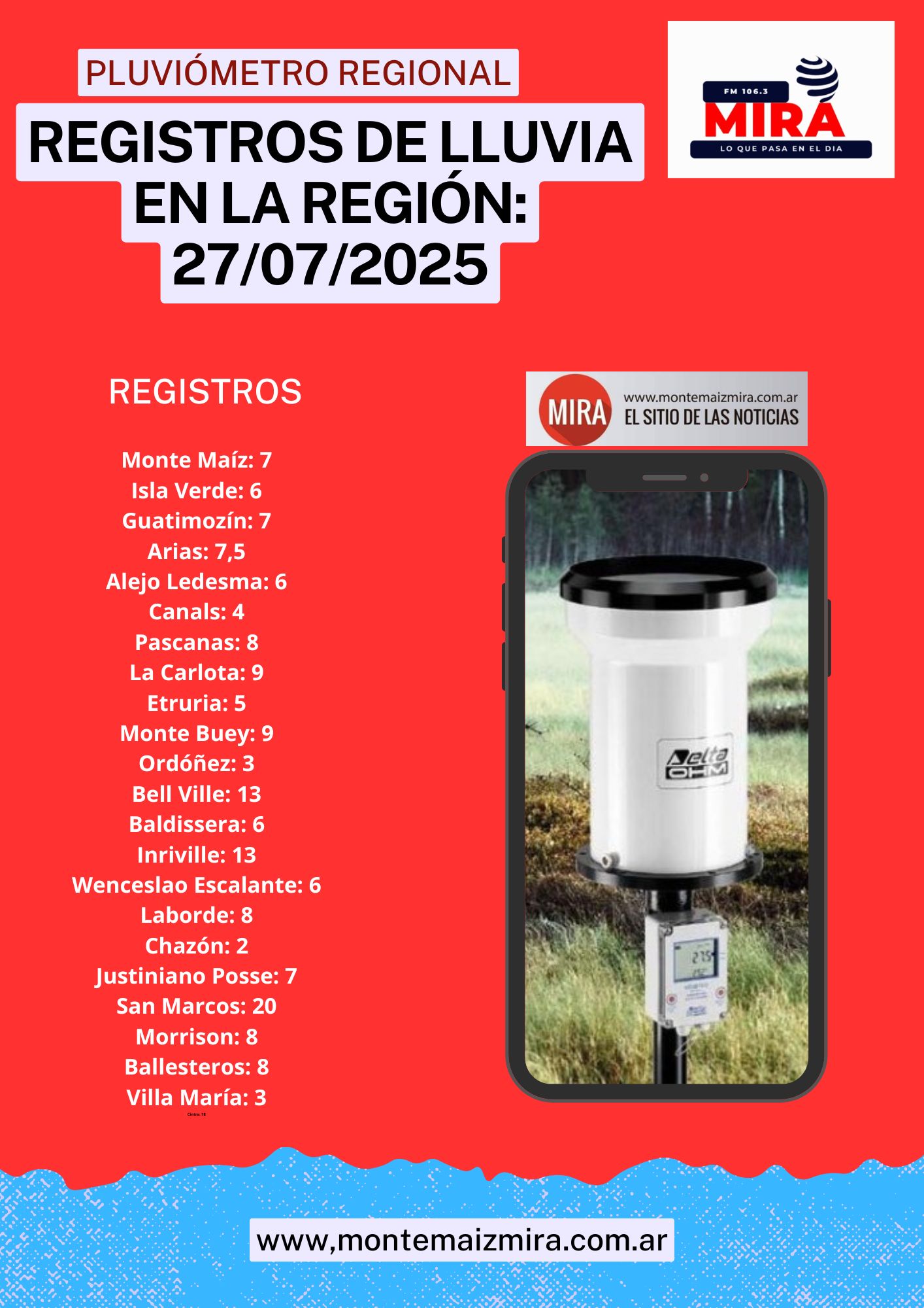 PLUVIÓMETRO REGIONAL: 27 DE JULIO DE 2025