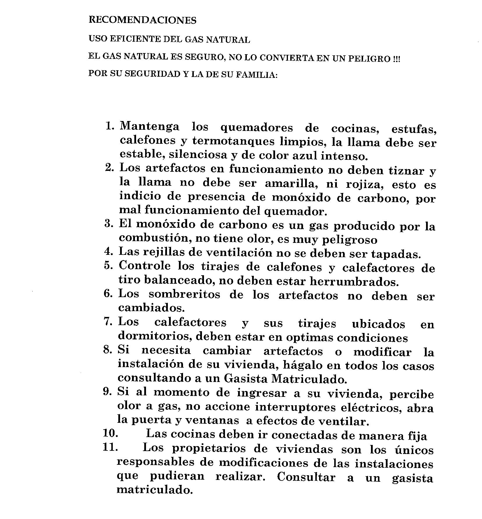 Ante tal situación el Ing. Juan José Alberione hizo un listado de recomendaciones a tener en cuenta que a continuación transcribimos para tener precaución. Así mismo se recomienda no entrar en pánico por hechos ocurridos en la región o en el resto del país y ante cualquier duda sobre el mal funcionamiento de artefactos o cañerías comunicarse rápidamente con la empresa al Te: 03468 – 479605 o hacer la consulta personalmente en la empresa.