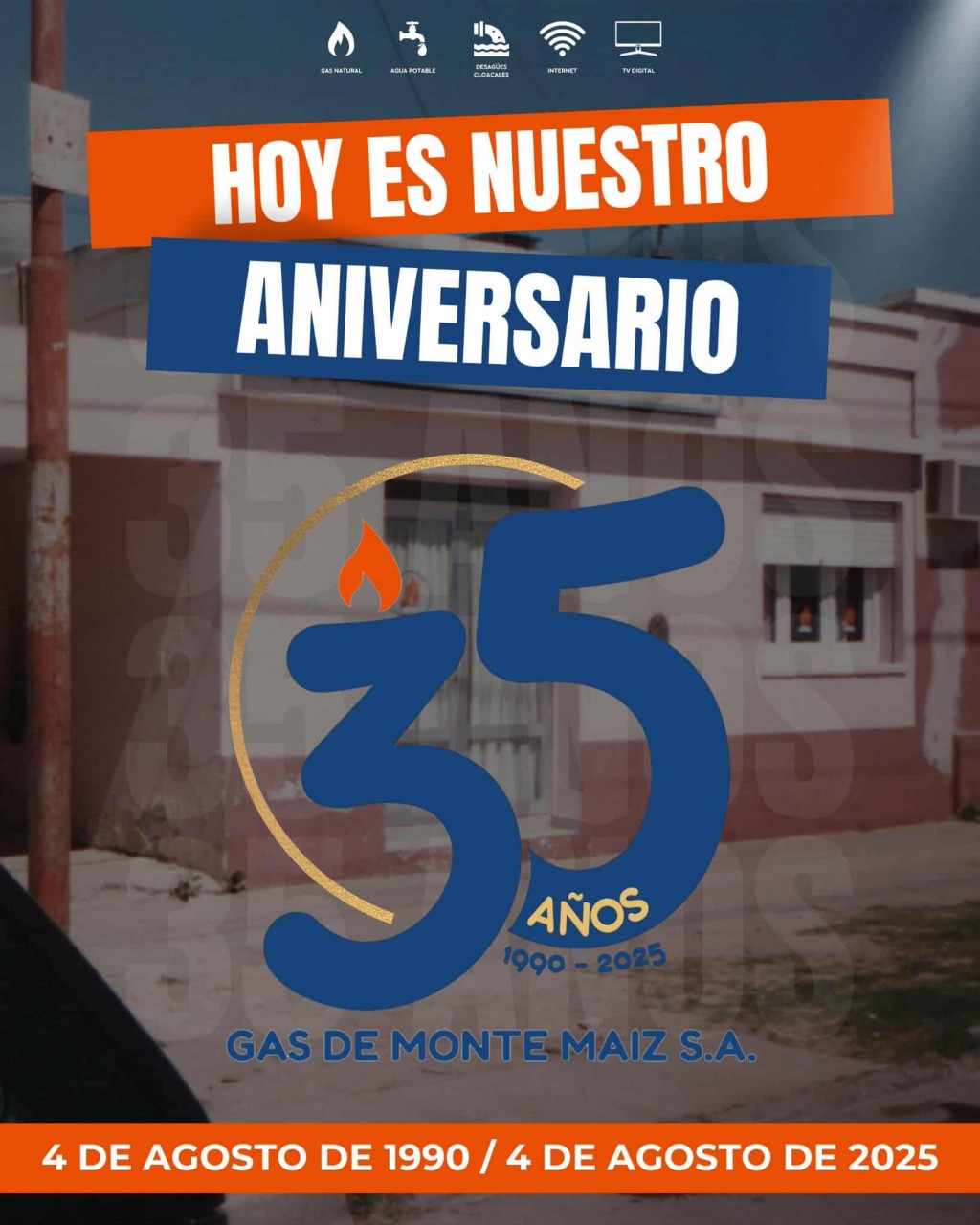 Un 4 de agosto de 1990 comenzamos un camino que no ha dejado de crecer. Hoy, Gas de Monte Maíz S.A. cumple 35 años brindando servicios esenciales que mejoran la calidad de vida de todos los vecinos: Gas Natural, Agua Potable, Desagües Cloacales, Internet y TV Digital