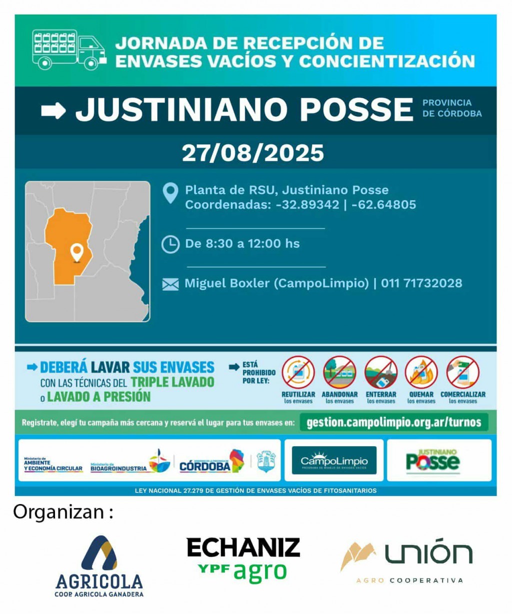 El próximo miércoles 27 de agosto, de 8:30 a 12:00, la planta de reciclado de la Municipalidad de Justiniano Posse será sede de una jornada de recepción de envases vacíos, organizada por Campo Limpio, la empresa Echanís, la Cooperativa Agrícola y la Cooperativa Unión. El Ing. Roque González destacó la importancia de esta iniciativa para promover la sustentabilidad y el cuidado del medio ambiente.