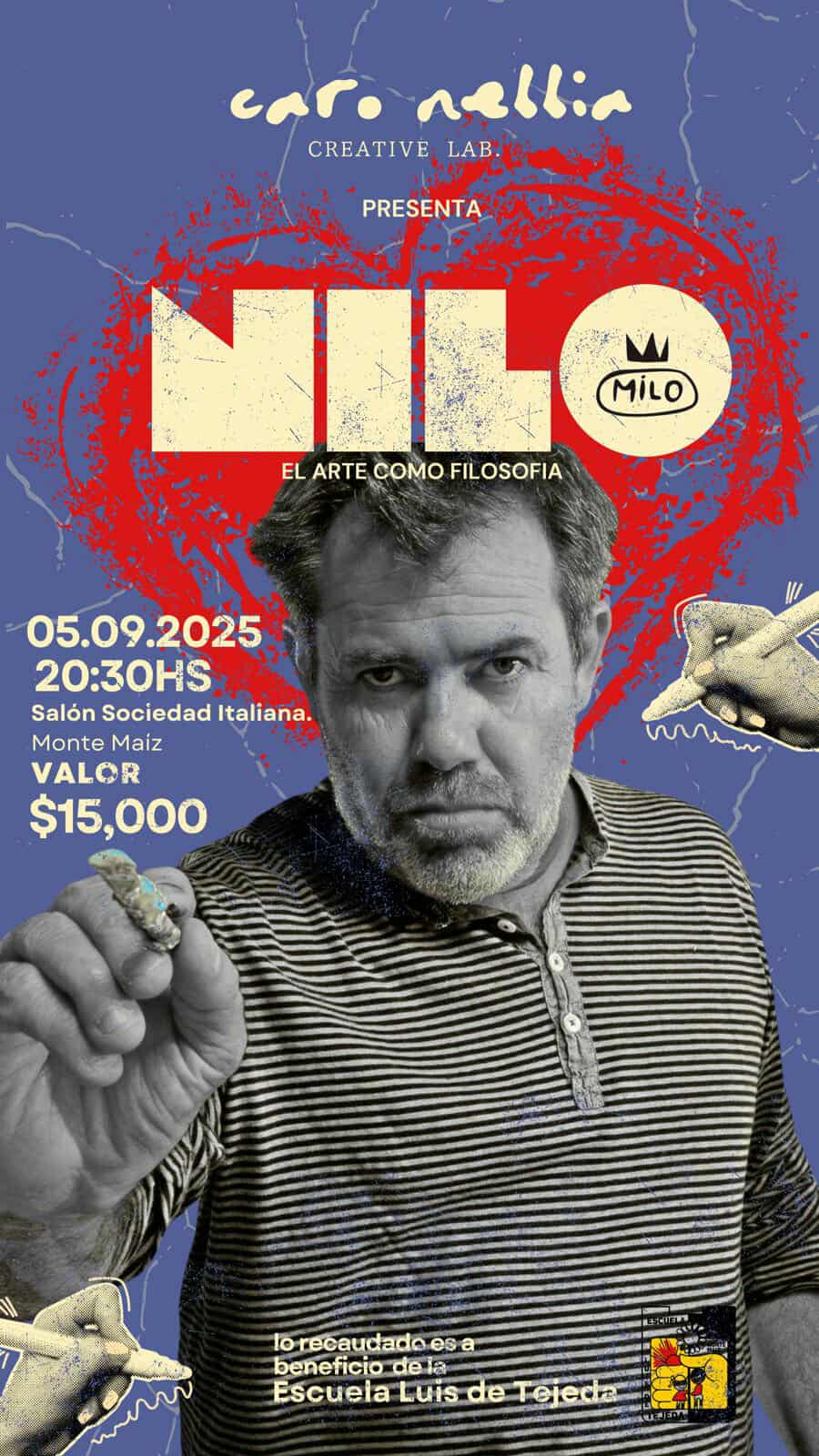 “La reconocida artista y empresaria Carolina Nebbia presenta un conversatorio con el aclamado artista Milo Lockett el 5 de septiembre a las 20:30 hs. en el Salón de la Sociedad Italiana de Monte Maíz. El evento, que promete una noche de arte y filosofía, tiene como objetivo recaudar fondos para la Escuela Luis de Tejeda. El valor de la entrada es de $15,000”.