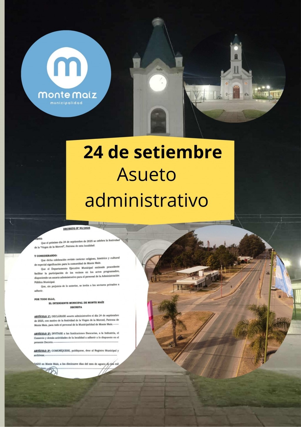 La Municipalidad de Monte Maíz ha decretado asueto administrativo para el día 24 de septiembre de 2025, con motivo de la festividad de la Virgen de la Merced, patrona de la localidad.