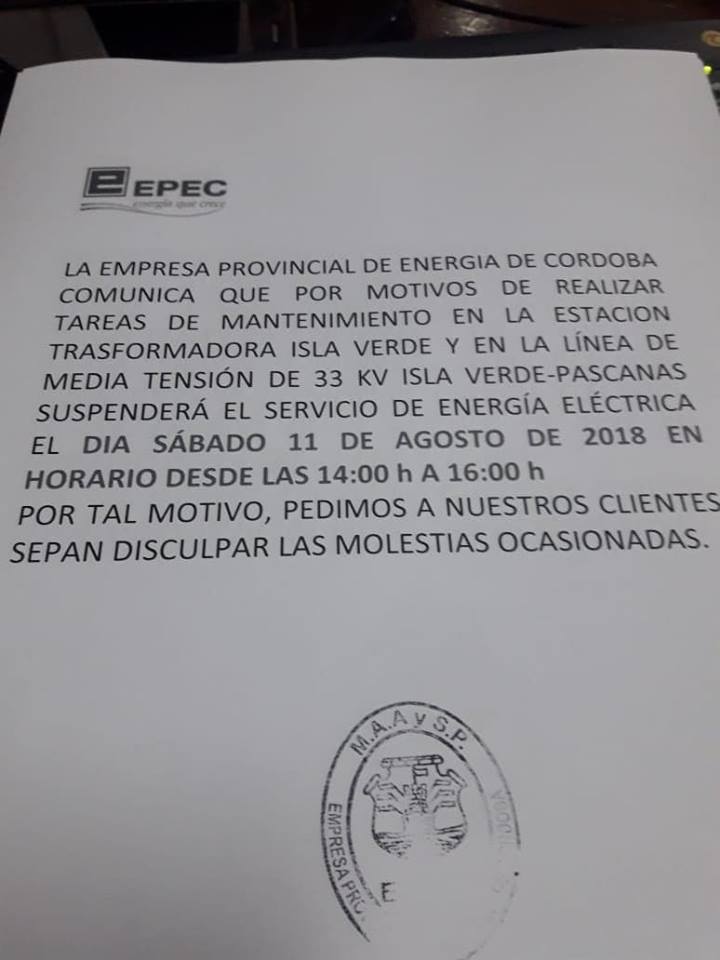 La Empresa Provincial de Energía de Córdoba comunica que por motivos de realizar tareas de mantenimiento en la Estación Transformadora Isla Verde y en la Línea de Media Tensión de 33 kv. Isla Verde Pascanas suspenderá el Servicio de Energía Eléctrica el día sábado 11 de agosto de 2018 en horario desde las 14:00 hs. hasta las 16:00 hs. Por tal motivo pedimos a nuestros clientes sepan disculpar las molestias ocasionadas.