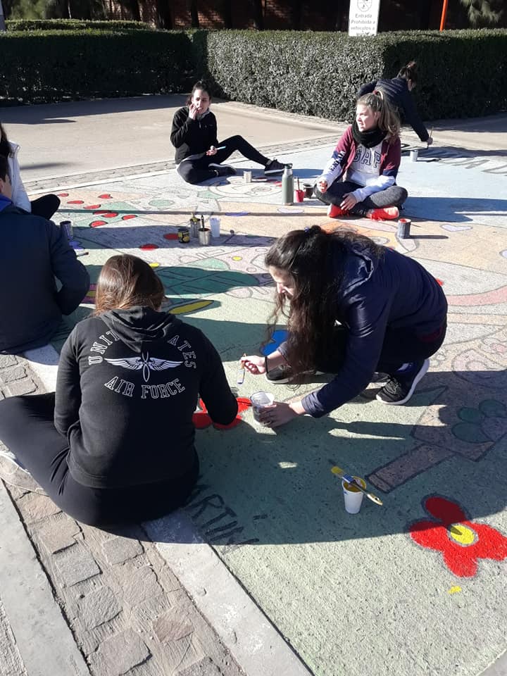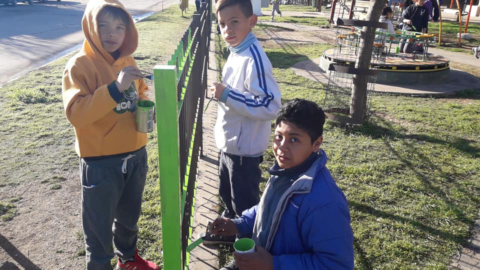 También hubo grupos de alumnos y Profesores que se dedicaron a limpiar y pintar el Paseo de la Hermandad que está pegadito al Parquecito. Allí se hicieron trabajos de mantenimiento de la limpieza del lugar y se hizo renovación de pintura en muros y bancos. Además se pintaron dos murales con mensajes alusivos a los niños.