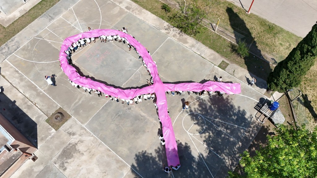Los alumnos de la Escuela Primaria José de San Martín de Monte Maíz realizaron un emotivo gesto en el marco del #OctubreRosa, formando un enorme lazo rosa para recordar la importancia de la prevención y el amor en la lucha contra el cáncer de mama.