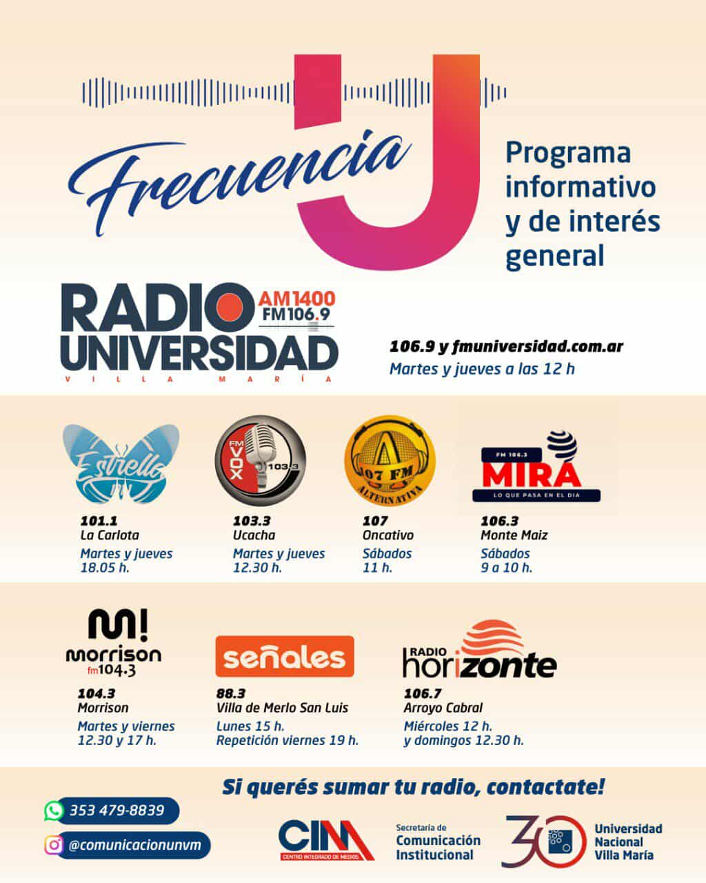 Desde el mes de setiembre formamos parte de la cadena de emisoras de la región que difunden el Programa “Frecuencia U” de la Universidad Nacional de Villa María.
