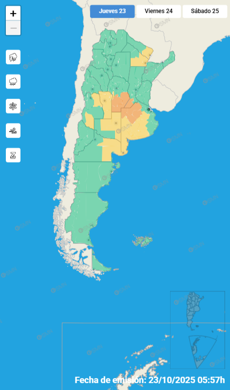 El área será afectada por tormentas fuertes o localmente severas. Se espera que las mismas puedan estar acompañadas por abundante caída de agua en cortos períodos, actividad eléctrica frecuente, granizo y ráfagas intensas que podrían alcanzar los 100 km/h. Se prevén valores de precipitación acumulada entre 70 y 100 mm, que pueden ser superados puntualmente.