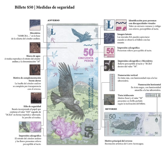 Como todos los billetes de esta nueva familia, cuenta con estrictas medidas de seguridad, entre las que se destacan la marca de agua -que reproduce el retrato del cóndor y, en la parte inferior, la denominación "50"-, y el hilo de seguridad, una banda incorporada al papel que contiene la leyenda "$50" seguido de "BCRA", en forma repetida y alternada.