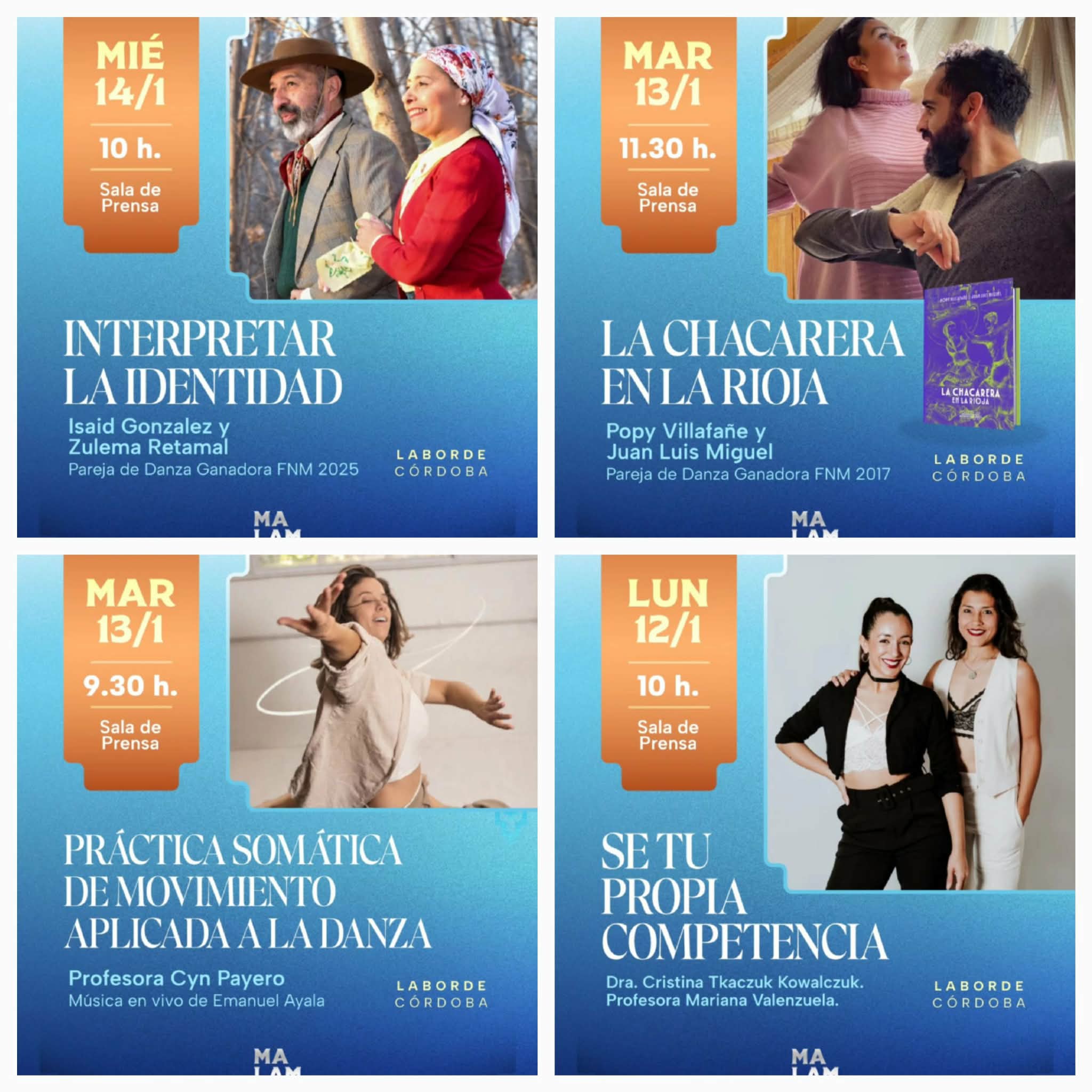La Comisión Organizadora del Festival Nacional del Malambo informa que, como en cada edición, durante la semana del Festival Nacional del Malambo se desarrollará una propuesta de charlas y talleres abiertos, destinados a bailarines, docentes, investigadores, estudiantes y público en general interesado en la danza, el cuerpo y el arte.