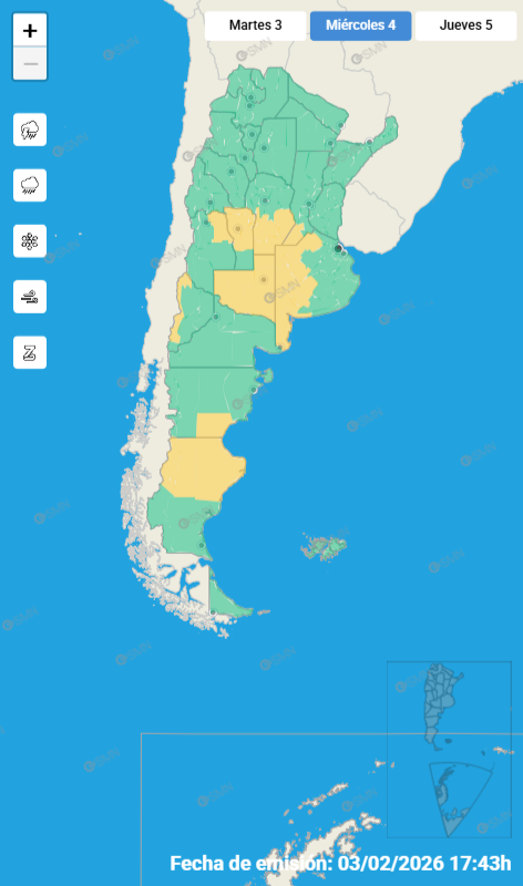 El área será afectada por tormentas de variada intensidad, algunas localmente fuertes. Las mismas estarán acompañadas principalmente por lluvias abundantes en cortos períodos, frecuente actividad eléctrica, granizo, y ráfagas intensas que pueden alcanzar los 75 km/h. Se prevén valores acumulados entre 20 y 50 mm, pudiendo ser superados de manera puntual.