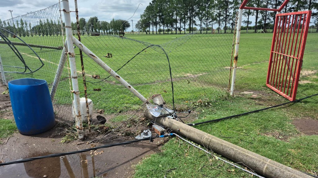 Además de las luminarias, el alambrado perimetral también sufrió roturas en varios sectores debido al impacto de las torres. Si bien la zona de vestuarios no se vio afectada en esta ocasión (a diferencia del fuerte temporal de 2021), el daño en el sistema de iluminación es casi total, ya que la mayoría de los artefactos se rompieron al golpear contra el suelo.