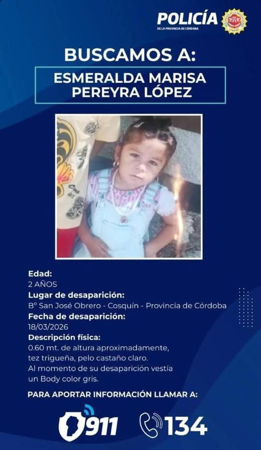 Se solicita a la comunidad cualquier tipo de información para dar con el paradero de ESMERALDA MARISA PEREYRA LÓPEZ de 2 años edad, la cual mide 60 cm de estatura, tez trigueña, pelo castaño claro y viste un body color gris. Fue vista por última vez en su domicilio ubicado en Bº San José Obrero (Cosquín).