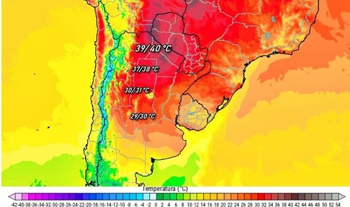 Entre 33 y 38°C (pudiendo ser superados en algunas zonas) miércoles 29 y jueves 30 en Santiago del Estero, este de Salta, Formosa, Chaco, oeste de Corrientes y norte de Santa Fe. Disminución de las temperaturas durante viernes 31, sábado 01 y domingo 02 en Mendoza, San Luis, Córdoba, La Pampa y oeste de la provincia de Buenos Aires, con mínimas entre -3 y 4°C, y valores menores en las zonas más elevadas.