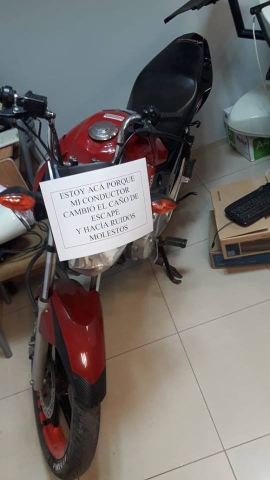 Una Motocicleta Honda Titán 150 c.c. de color rojo que había sido secuestrada el viernes por la tarde quedó guardada en la Oficina de tránsito de la Municipalidad con un cartel que dice: “Estoy acá porque mi conductor cambió el caño de escape y hacía ruidos molestos”.