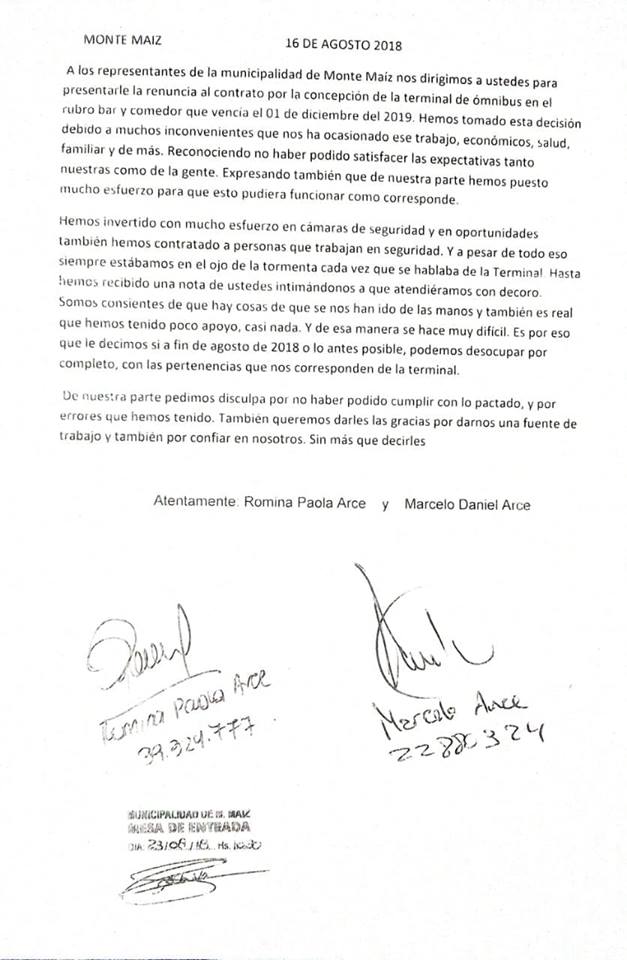 Marcelo Arce y su familia han decidido retirarse de la concesión del Bar y Comedor de la Estación Terminal de Ómnibus de Monte Maíz. Así lo manifestó el titular del contrato, Marcelo Arce, quien mediante una nota dirigida al Ejecutivo Municipal dijo que, entre otras cosas, había decidido declinar el contrato por no haber tenido ayuda suficiente de la Municipalidad. Además adujo problemas económicos y familiares por el trabajo en la Terminal.