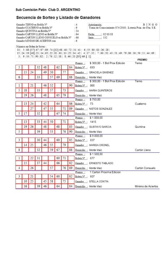 El martes 02 de octubre se llevó acabo una nueva edición del Bingo Computarizado y Televisado de la Subcomisión de Patín del Club D. Argentino. Estos fueron los Ganadores: