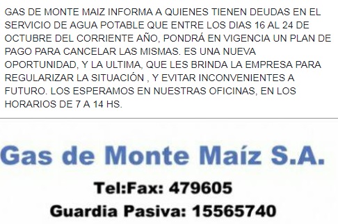 “GAS DE MONTE MAIZ INFORMA A QUIENES TIENEN DEUDAS EN EL SERVICIO DE AGUA POTABLE QUE ENTRE LOS DIAS 16 AL 24 DE OCTUBRE DEL CORRIENTE AÑO, PONDRÁ EN VIGENCIA UN PLAN DE PAGO PARA CANCELAR LAS MISMAS. ES UNA NUEVA OPORTUNIDAD, Y LA ULTIMA, QUE LES BRINDA LA EMPRESA PARA REGULARIZAR LA SITUACIÓN , Y EVITAR INCONVENIENTES A FUTURO. LOS ESPERAMOS EN NUESTRAS OFICINAS, EN LOS HORARIOS DE 7 A 14 HS”.