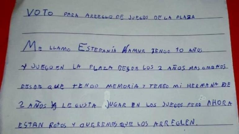 En la carta, la niña escribió: "Voto para arreglo de juegos de la plaza".