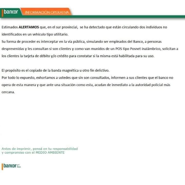 Nota de Bancor alertando sobre la presencia de estafadores en el interior Provincial