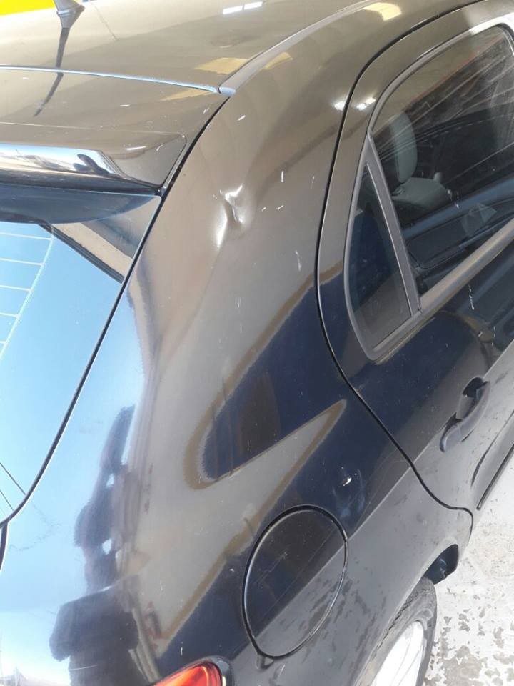 El día 8 de julio informábamos sobre algunos pasacalles que había colocado, en el centro del pueblo, la familia de Nayara Ibarbia, la joven que falleció el 3 de mayo del corriente año a causas de las heridas que le provocó un choque cuando se conducía con su novio e impactaron contra un camión estacionado. El martes el pasacalles que estaba colocado frente al Hospital Municipal cayó sobre un auto Fiat Palio color gris oscuro, propiedad de la Sra. Candelaria García. Al regresar al lugar se encontró que su auto aún estaba siendo impactado por una de las varilla de madera que tiene en los extremos. Debido al viento, el pasacalles se desenganchó y cayó de oeste a este impactando en varias oportunidades al vehículo por el efecto vaivén al quedar prendido desde un solo extremo. El auto sufrió varios impactos que ocasionaron abolladuras de distinta consideración y distintos lugares.