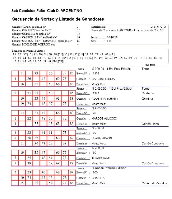 El martes 30 de octubre se llevó a cabo otro sorteo del Bingo Computarizado y Televisado de la Subcomisión de Patín del Club Deportivo Argentino. La locución estuvo a cargo de Rubén Bertinetti y el sorteo estuvo Fiscalizado por la Escribana Ana Julia Ortolani.