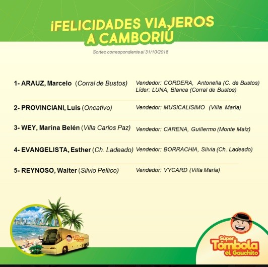 Se llevó a cabo un nuevo sorteo de la Súper Tómbola El Gauchito que sigue repartiendo premios en todo el país. En el Sorteo Mensual correspondiente a octubre regaló 25 viajes a Camboriú para dos personas. Mirá la Lista de Ganadores: