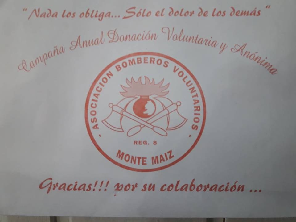 La Asociación de Bomberos Voluntarios de Monte Maíz comunica a toda la población que la recolección de sobres por la 37° Campaña del sobre para la donación Anual, Voluntaria y Anónima se pospone para el sábado 17 de noviembre del corriente año.