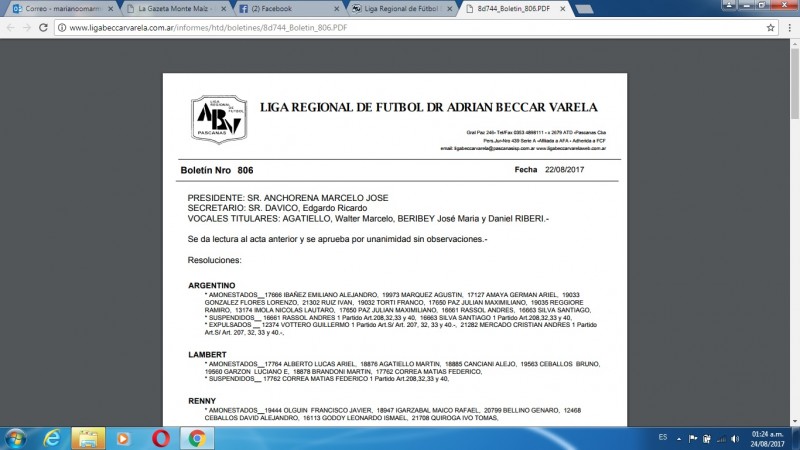 PRESIDENTE: SR. ANCHORENA MARCELO JOSE SECRETARIO: SR. DAVICO, Edgardo Ricardo VOCALES TITULARES: AGATIELLO, Walter Marcelo, BERIBEY José Maria y Daniel RIBERI.- Se da lectura al acta anterior y se aprueba por unanimidad sin observaciones.- Resoluciones: ARGENTINO * AMONESTADOS__17666 IBAÑEZ EMILIANO ALEJANDRO, 19973 MARQUEZ AGUSTIN, 17127 AMAYA GERMAN ARIEL, 19033 GONZALEZ FLORES LORENZO, 21302 RUIZ IVAN, 19032 TORTI FRANCO, 17650 PAZ JULIAN MAXIMILIANO, 19035 REGGIORE RAMIRO, 13174 IMOLA NICOLAS LAUTARO, 17650 PAZ JULIAN MAXIMILIANO, 16661 RASSOL ANDRES, 16663 SILVA SANTIAGO, * SUSPENDIDOS__ 16661 RASSOL ANDRES 1 Partido Art.208,32,33 y 40, 16663 SILVA SANTIAGO 1 Partido Art.208,32,33 y 40, * EXPULSADOS __ 12374 VOTTERO GUILLERMO 1 Partido Art.S/ Art. 207, 32, 33 y 40.-, 21282 MERCADO CRISTIAN ANDRES 1 Partido Art.S/ Art. 207, 32, 33 y 40.-, LAMBERT * AMONESTADOS__17764 ALBERTO LUCAS ARIEL, 18876 AGATIELLO MARTIN, 18885 CANCIANI ALEJO, 19563 CEBALLOS BRUNO, 19560 GARZON LUCIANO E, 18878 BRANDONI MARTIN, 17762 CORREA MATIAS FEDERICO, * SUSPENDIDOS__ 17762 CORREA MATIAS FEDERICO 1 Partido Art.208,32,33 y 40, RENNY * AMONESTADOS__19444 OLGUIN FRANCISCO JAVIER, 18947 IGARZABAL MAICO RAFAEL, 20799 BELLINO GENARO, 12468 CEBALLOS DAVID ALEJANDRO, 16113 GODOY LEONARDO ISMAEL, 21708 QUIROGA IVO TOMAS, OLIMPO * AMONESTADOS__15948 LEZCANO AGUSTIN EDUARDO, 17907 CAUDANA AGUSTIN, RECREATIVO * AMONESTADOS__15133 PISTONE FACUNDO EDUARDO, 17076 SENESTRARI FEDERICO, 16354 GIRAUDO FEDERICO LUIS, 21882 GALERA NAHUEL MARIO, ATLETICO * AMONESTADOS__20212 SERRANO GONZALO DAMIAN, 14553 MORALES NICOLAS, 20833 SASSO FRANCO, 13533 RABBIA SERGIO DANIEL, 18899 VASCONI GUSTAVO, 21295 DEPETRIS FEDERICO, 19719 PIRCHIO MASSIMO ROBERTO, 13753 INSUA PATRICIO, 19470 GARCIA BONACEA AGUSTIN V, 20058 SAPPEI WALTER, 16517 BARRETO MARCELO ARIEL, 17235 SCAVARDA AXEL, 16531 PRADO SERGIO FACUNDO, 20317 ANDRES DAVID ANDRE, * SUSPENDIDOS__ 20317 ANDRES DAVID ANDRE 1 Partido Art.208,32,33 y 40, * EXPULSADOS __ 20651 MONTERO ALMANZA ELVIO 1 Partido Art.S/ Art. 154, 32, 33 y 40.-, 1281 SAPPEI CESAR DOMINGO 2 Partidos Art.S/ Art. 201 inc. "b,1", 32, 33 y 40.-, 20893 VILARCHIK CRISTIAN LEONEL 2 Partidos Art.S/ Art. 201 inc. "b,4", 32, 33 y 40.-, INDEPENDIENTE * AMONESTADOS__14169 MORALES ANGEL DAVID, 20805 MANZANO EZEQUIEL, 17639 GRANDI FERMIN AUGUSTO, 17639 GRANDI FERMIN AUGUSTO, 20713 SUAREZ JUAN MANUEL, * EXPULSADOS __ 17858 BIANCIOTTI MARIANO LEANDRO 1 Partido Art.S/ Art. 154, 32, 33 y 40.-, SP. CHAZON * AMONESTADOS__20586 LEIGGENER FRANCISCO, 20802 MARINO LAUTARO, 17443 OVIEDO HERNAN HUGO, 16478 TAVECCHIO RODRIGO NICOLAS, 20553 DELUCHI TOMAS BENJAMIN, 14436 GOTTERO RICARDO ALEJANDRO, 20051 BOZZO NAHUEL, 20064 AZCARATE EMMANUEL, * SUSPENDIDOS__ 20064 AZCARATE EMMANUEL 1 Partido Art.208,32,33 y 40, * EXPULSADOS __ 15815 BASCONCELO AXEL N. 1 Partido Art.S/ Art. 186, 32, 33 y 40.-, 15380 VAZQUEZ ARIEL 1 Partido Art.S/ Art. 207, 32, 33 y 40.-, 20053 PEREYRA GINO HECTOR 1 Partido Art.S/ Art. 154, 32, 33 y 40.-, 20306 PEREYRA HUGO SEBASTIAN 3 Partidos Art.S/ Art. 200 inc. "a,8" , 32, 33 y 40.-, ATENAS * AMONESTADOS__17770 SAN-MARTIN JULIAN, 19867 FUNES BRIAN GABRIEL, 16760 PRATO IGNACIO, 16278 PEYRANO FRANCISCO LIMBERT, * SUSPENDIDOS__ 16278 PEYRANO FRANCISCO LIMBERT 1 Partido Art.208,32,33 y 40, * EXPULSADOS __ 19703 MONDINO-PRIOTO FILIPO 1 Partido Art.S/ Art. 154, 32, 33 y 40.-, NEWBERY * AMONESTADOS__20321 RIVERA GUILLERMO JESUS, 19372 OLMEDO MAXIMILIANO JESUS, 16772 FRACCAROLLI ENZO, 19651 GALVAN BRIAN RICARDO, SP.RURAL * AMONESTADOS__13298 ANDRADA ENZO FEDERICO, 19229 BERSIA DIEGO MARTIN, 17440 VILLAN AGUSTIN, 19488 GAMBA JUAN FERNANDO, 17035 DEMARIA JUAN JOSE, 15857 TAVECCHIO ALEXIS M., 13082 ANDRADA IVAN IGNACIO, * SUSPENDIDOS__ 17035 DEMARIA JUAN JOSE 1 Partido Art.208,32,33 y 40, 15857 TAVECCHIO ALEXIS M. 1 Partido Art.208,32,33 y 40, 13082 ANDRADA IVAN IGNACIO 1 Partido Art.208,32,33 y 40, SARMIENTO(E) * AMONESTADOS__20869 SUAREZ LAUTARO, 19476 RODRIGUEZ ARIEL ALEJANDRO, TALLERES * AMONESTADOS__19954 VARELA NATANAEL R, 14099 BARBETTA FEDERICO PABLO, 14072 CEBALLOS LUCIANO MARTIN, 19364 AUBERT HECTOR, 14874 MENDEZ DANIEL EDGARDO, 21009 FUNES NICOLAS ARIEL, 17385 NICOLA BRUNO, LAGUNENSE * AMONESTADOS__20196 FAVALLI JEREMIS RAUL, 21071 TOLOSA ROMAN JESUS, 19464 LORENZATTI AGUSTIN AMERICO, 19466 MONTELIRIO DIEGO MARTIN, SARMIENTO(I) * AMONESTADOS__19224 ORTIZ MAURICIO JAVIE, 19518 VILLAFAÑE CEFERINO, 20286 TORANZA RODRIGO ALBERTO, 19753 ORIZI AARON MANUEL, 16745 FENOGLIO MARCOS BENJAMIN, 17797 CAPURRO RAMIRO, 12805 JAURENA GONZALO, 19807 ARRIBAS MATEO JOSE, 21435 MONTENEGRO ESTEBAN EZEQUIEL, * EXPULSADOS __ 17794 CABALLERO ALAN EXEQUIE 1 Partido Art.S/ Art. 207, 32, 33 y 40.-, 17559 LEIVA EMANUEL DAVID 2 Partidos Art.S/ Art. 201 inc. "b,4", 32, 33 y 40.-, BENGOLEA * AMONESTADOS__21626 GONZALEZ AXEL BRIAN, * EXPULSADOS __ 21437 GUENDULAIN VALENTIN 1 Partido Art.S/ Art. 154, 32, 33 y 40.-, Se sanciona al Sr. SAN EMETERIO Ignacio DNI: 33.387.973 Director Técnico Fútbol Infantil del Club A. Lambert, según el informe arbitral del Sr. SIVEL Marcos, del partido disputado el día 19 de Agosto del cte., entre los pares del Club A. Atenas Vs. Club A. Lambert en Categoría Sub- 15 con 4 (cuatro) partidos de suspensión S/Art. 186, 260, 32, 33 y 40.- Se sanciona al Sr. SERRANO Juan Carlos DNI: 14.993.007 Director Técnico Fútbol Infantil del Club Atlético y B. Pascanas, según el informe arbitral del Sr. COLAZO Gabriel, del partido disputado el día 19 de Agosto del cte., entre los pares del Club Atletico y B. Pascanas Vs. Club Sp. Chazon en Categoría 2008 con 3 (tres) partidos de suspensión S/Art. 186, 260, 32, 33 y 40.- Se sanciona al Sr. CUELLO Ruben DNI: 24.736.720 Director Técnico Fútbol Mayor del Club Atlético y B. Pascanas, según el informe arbitral del Sr. CARRANZA Alex, del partido disputado el día 20 de Agosto del cte., entre los pares del Club Atletico y B. Pascanas Vs. Club D. Argentino en Primera División con 2 (d