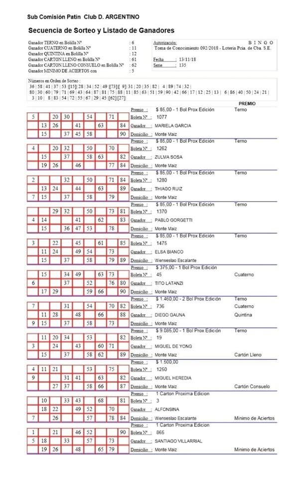 El martes 13 de noviembre se llevó a cabo el penúltimo sorteo del Bingo Computarizado y Televisado de la Subcomisión de Patín del Club Deportivo Argentino. Contó con la Fiscalización de la Escribana Ana Julia Ortolani y los ganadores fueron los siguientes: