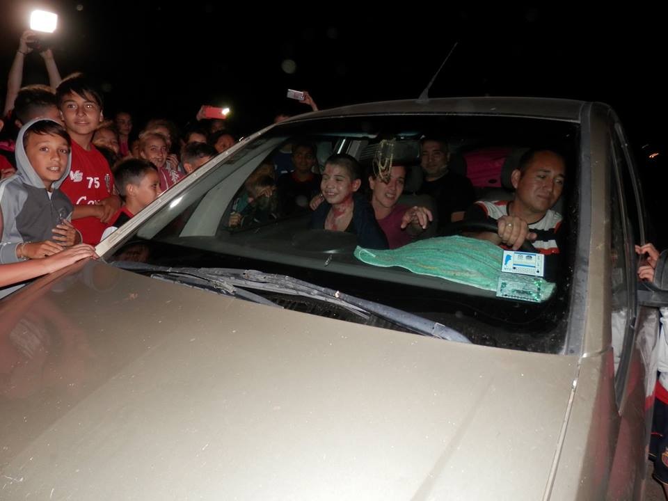 Un centenar de chicos y chicas, acompañado de sus familiares se llegaron al acceso oeste de la población para darle la bienvenida a Brunito y sus padres.