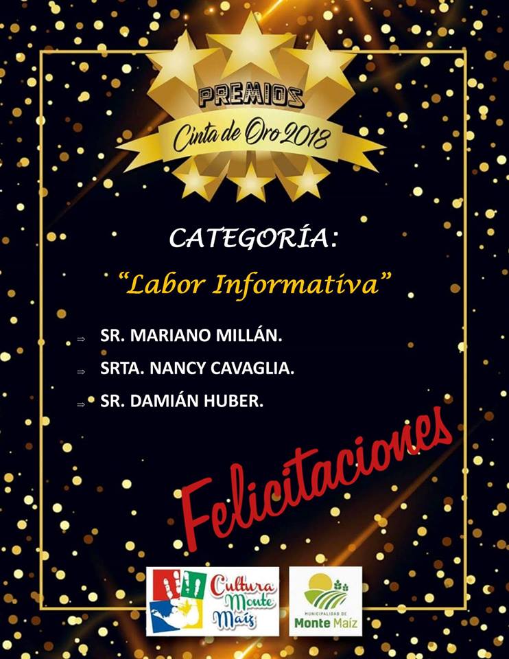 Quedaron conformadas las Ternas para la entrega de los Premios “Cintas de Oro” a los destacados de nuestra localidad en el 2018.