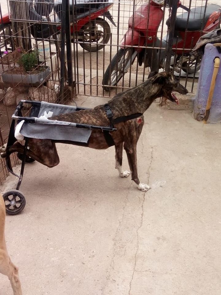 Silvia Villegas, del Hogar Colitas de Monte Maíz, adoptó una perra galga accidentada a quien bautizó como “Pintita”. La perra fue encontrada en los montes del predio del ferrocarril en mal estado ya que no se podía incorporar por alguna lesión de gravedad en la columna.