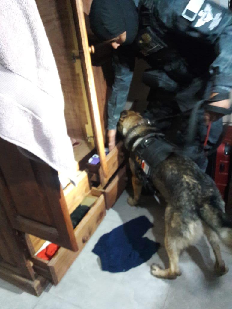 El perro Dago de la división K-9 halló en el domicilio varias dosis de cocaína, un revolver con municiones, dinero en efectivo ( $ 55.995) y elementos presuntamente relacionados al fraccionamiento y comercialización de estupefacientes.