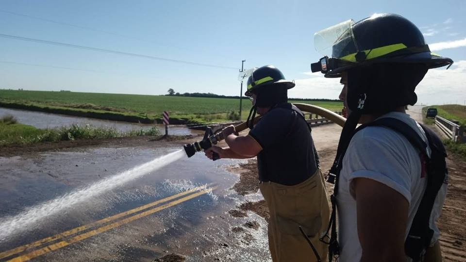 Previo a la habilitación de la ruta Provincial N°11 trabajaron en el lugar Bomberos Voluntarios de Monte Maíz quienes se hicieron presentes en el lugar con un camión y dos efectivos para efectuar las tareas de limpieza del área reparada.