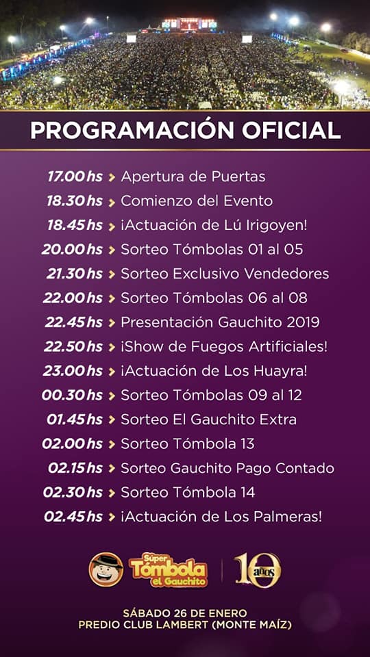 La apertura de las puertas se hará a las 17: 00 hs. y el comienzo del evento está previsto para las 18:30 hs. El primer espectáculo musical estará a cargo de Lú Irigoyen a las 18:45 hs. y a las 20:00 hs. darán comienzo los sorteos. Promediando la noche actuarán Los Huayra a las 23.00 hs. Y en el cierre, ya con todos los sorteos finalizados actuarán Los Palmeras.