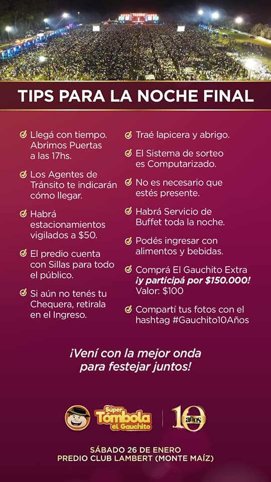 El sábado 26 de enero se llevará a cabo el Sorteo Final de la Edición 2018 de la Súper Tómbola El Gauchito. El mismo tendrá lugar en el predio ubicado al Norte del Poli Deportivo de Lambert y se espera recibir a unas 30.000 personas.