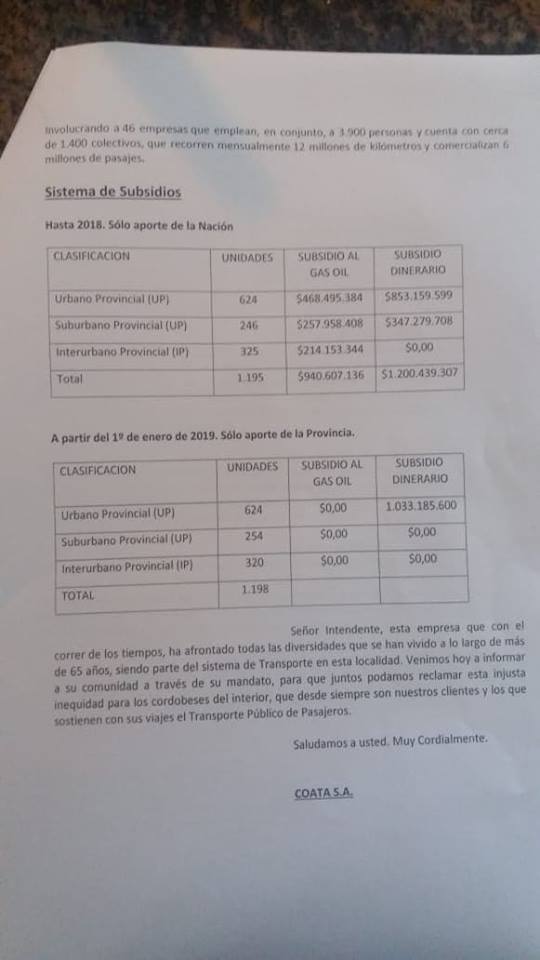 La situación de la quita de subsidios al combustible vino acompañada de una respuesta del Gobierno Provincial que no alcanza para solucionar una grave situación. El Gobierno de la Provincia de Córdoba hará un aporte de $1.033.000 destinados a las empresas que cubren una distancia que no supere los 60 kms. desde las ciudades metropolitanas.