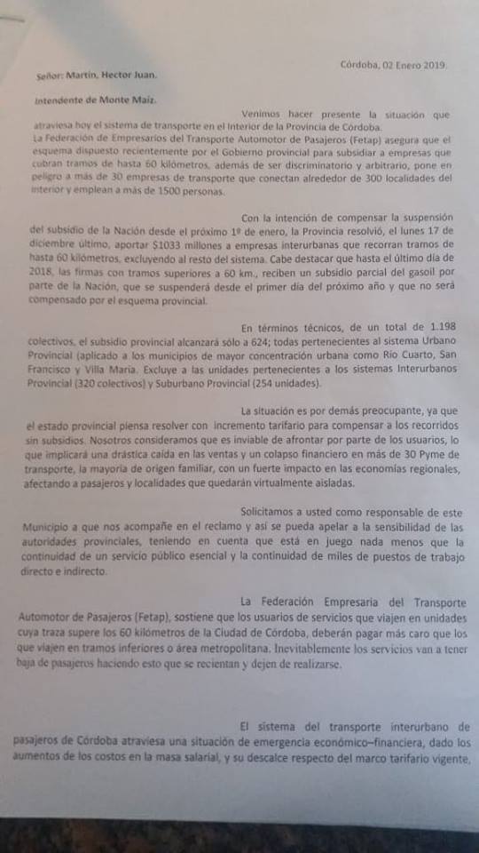 El transporte Interurbano de pasajeros atraviesa una grave crisis por el aumento de la masa salarial y su descalce respecto del marco tarifario vigente. Esta situación pone en peligro la interconectividad de más de 300 localidades del interior Provincial. El Funcionario de la empresa que estuvo en nuestra localidad dejóuna Nota Informativa sobre la situación del Transporte Público Interurbano.