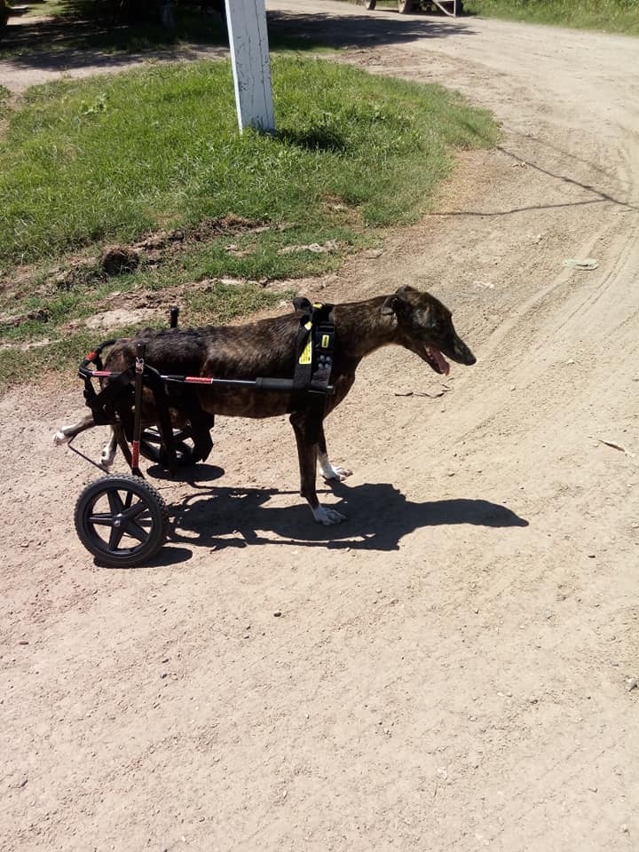 De esta manera, ya hay dos perros con aparatos ortopédicos en Monte Maíz y los dos animales fueron adoptados por Silvia, quien le dedica mucho tiempo a cada uno de ellos. Uno es el perrito “Pérez” (Foto Interna cuando estrenó su aparato en la plaza) y ahora la perra Galga “Pintita”.